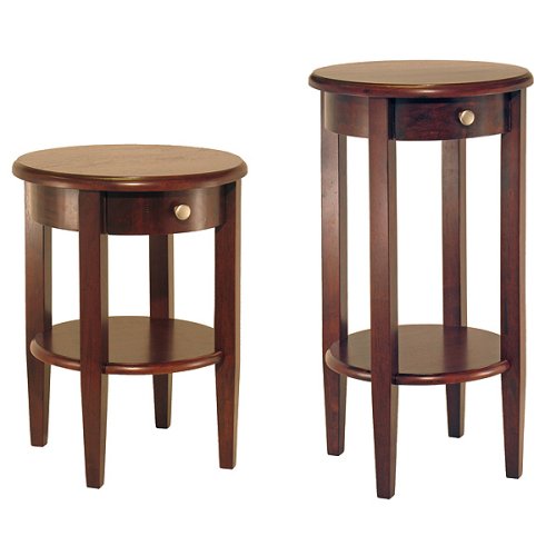 - Dark antiqued walnut-stain tables have tapered legs, a satin nickel knob and a 4-point base- Collection includes coffee, hall, end and side tables (each sold separately)