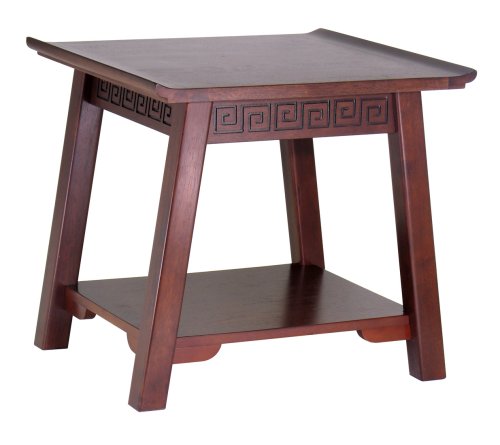 - Asian-inspired end table with winged top, bold geometric detailing, and minimalist silhouette- Solid wood with rich Antique Walnut finish